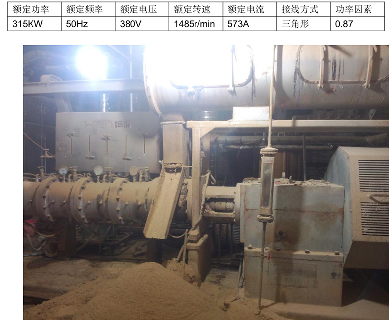 2、 、 改造設備概述: :客戶要求改造的設備為膨化機,達315KW 功率(實際銘牌數(shù)據(jù)如下表1)。膨化機工作原理為:利用膨化機的不等距非標準螺旋系統(tǒng)的擠壓推進,物料中的氣體被排出,并迅速被物料填充,物料受剪切力作用而產生回流,使機膛內的壓力增大,隨著摞旋與機膛間的磨擦使物料充分混合、擠壓、加熱、膠合、糊化而產生組織變化,原有的結構受到破壞,同時機械能通過物料在膛內的磨擦作用而轉化為熱能,使物料成為具有流動性質的膠凝狀態(tài),物料被擠壓到出口時壓力由高壓瞬間變?yōu)槌海筛邷厮查g變?yōu)槌?,造成水分迅速地從組織結構中蒸發(fā)出來,使其內部形成無數(shù)微孔結構,再通過切割裝置,切割冷卻即膨化成形。