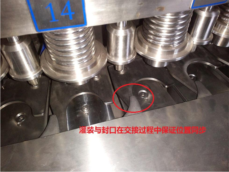 2、在運行過程中始終保持工位一一對應,實現(xiàn)灌裝機和封口機位置同步,保證灌裝與封口環(huán)節(jié)的平滑交接,不影響罐內液體容量偏差和保證罐體外形完好無損