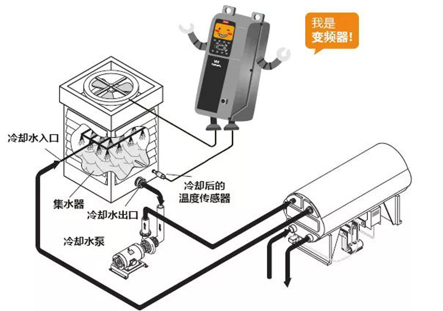 加入變頻器后,操作十分簡單,設(shè)定制冷機(jī)組所需要的冷卻水溫度、溫度傳感器必要參數(shù),變頻器便可對冷卻塔的散熱風(fēng)機(jī)轉(zhuǎn)速進(jìn)行實時的動態(tài)控制啦~
