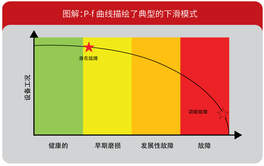 基于工況的維護是利用獲取的數(shù)據(jù)監(jiān)測現(xiàn)有設(shè)備的健康狀況。為此,要選擇關(guān)鍵參數(shù)作為識別發(fā)展性故障的指標。設(shè)備狀況通常會隨著時間的推移而下滑。P-f 曲線表明了典型的下滑模式。設(shè)備不能執(zhí)行預(yù)期的功能時,就會發(fā)生功能故障。基于工況的維護就是要在故障真正發(fā)生之前檢測潛在的故障。規(guī)劃維護措施的優(yōu)勢如下: