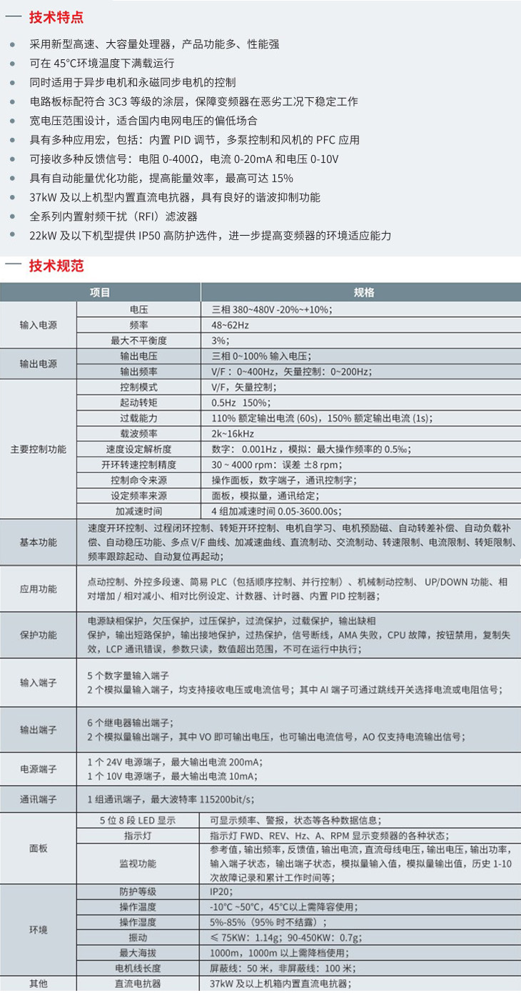 22kW及以下機(jī)型提供IP50高防護(hù)選件,進(jìn)一步提高變頻器的環(huán)境適應(yīng)能力