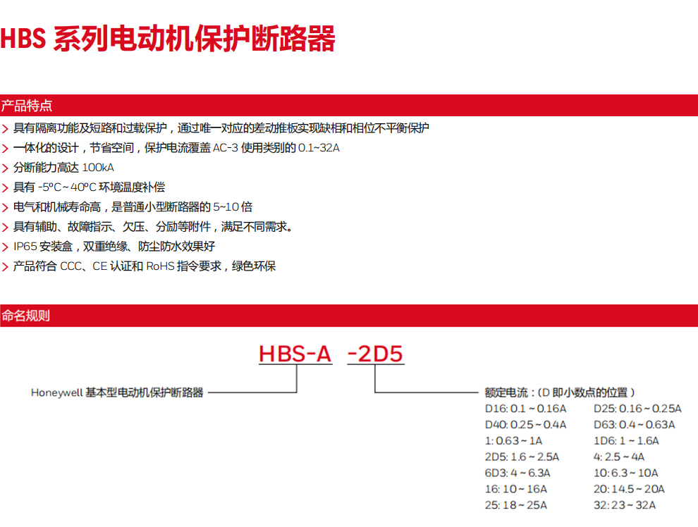 霍尼韋爾HBS系列電動機保護斷路器
