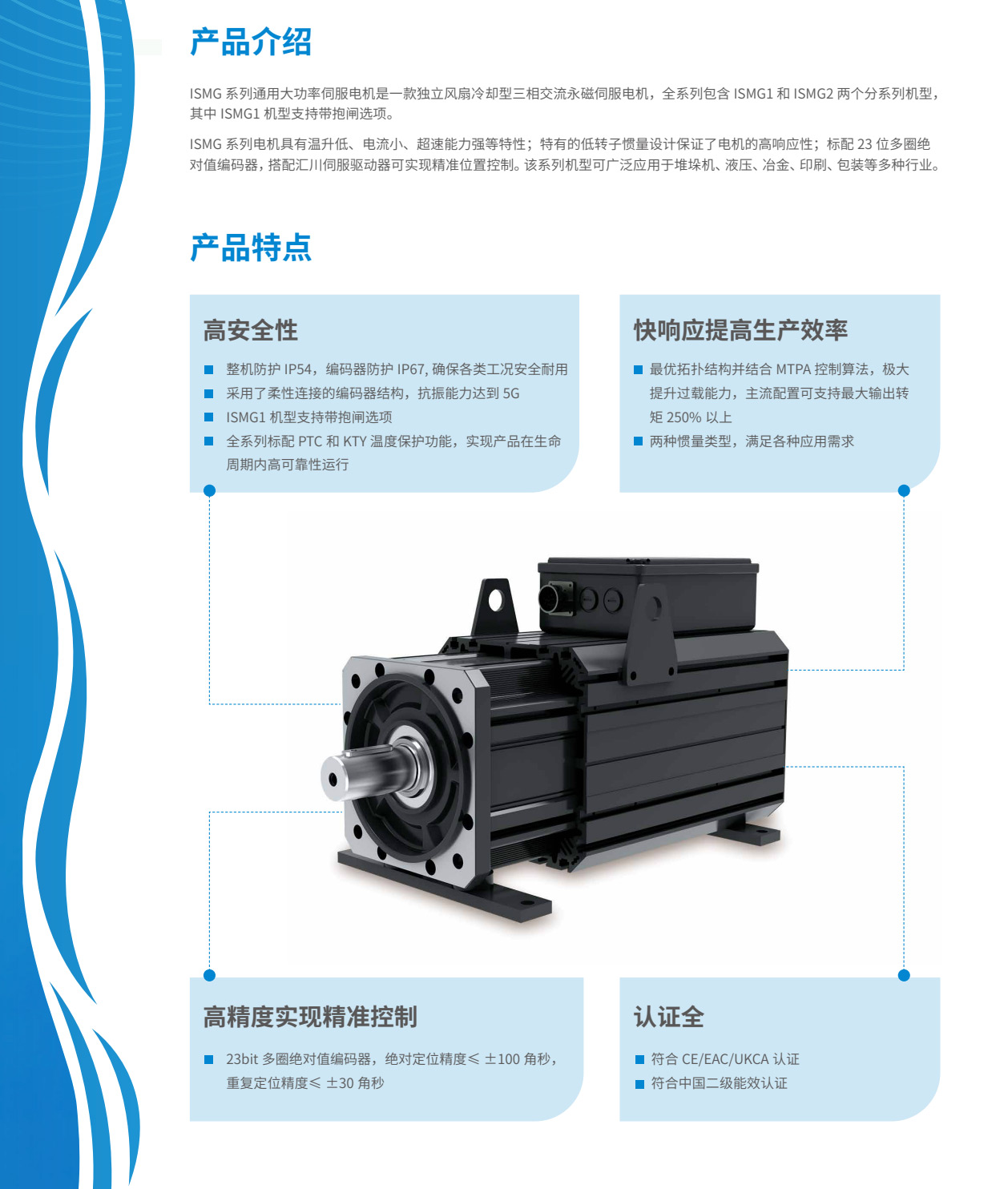 ISMG系列伺服電機(jī)產(chǎn)品,功率覆蓋7.5 kW ~ 80 kW、標(biāo)配23 位絕對(duì)值編碼器;產(chǎn)品的IP54 防護(hù)等級(jí)設(shè)計(jì)、耐沖擊振動(dòng)的編碼器結(jié)構(gòu)設(shè)計(jì)保證了產(chǎn)品可以覆蓋絕大多數(shù)工業(yè)場(chǎng)合的應(yīng)用;獨(dú)特的電磁設(shè)計(jì)及風(fēng)冷回路設(shè)計(jì)、內(nèi)置熱保護(hù)器,實(shí)現(xiàn)了產(chǎn)品在生命周期內(nèi)高可靠性運(yùn)行;ISMG1系列亦可加裝150 N·m 制動(dòng)扭矩的制動(dòng)器。