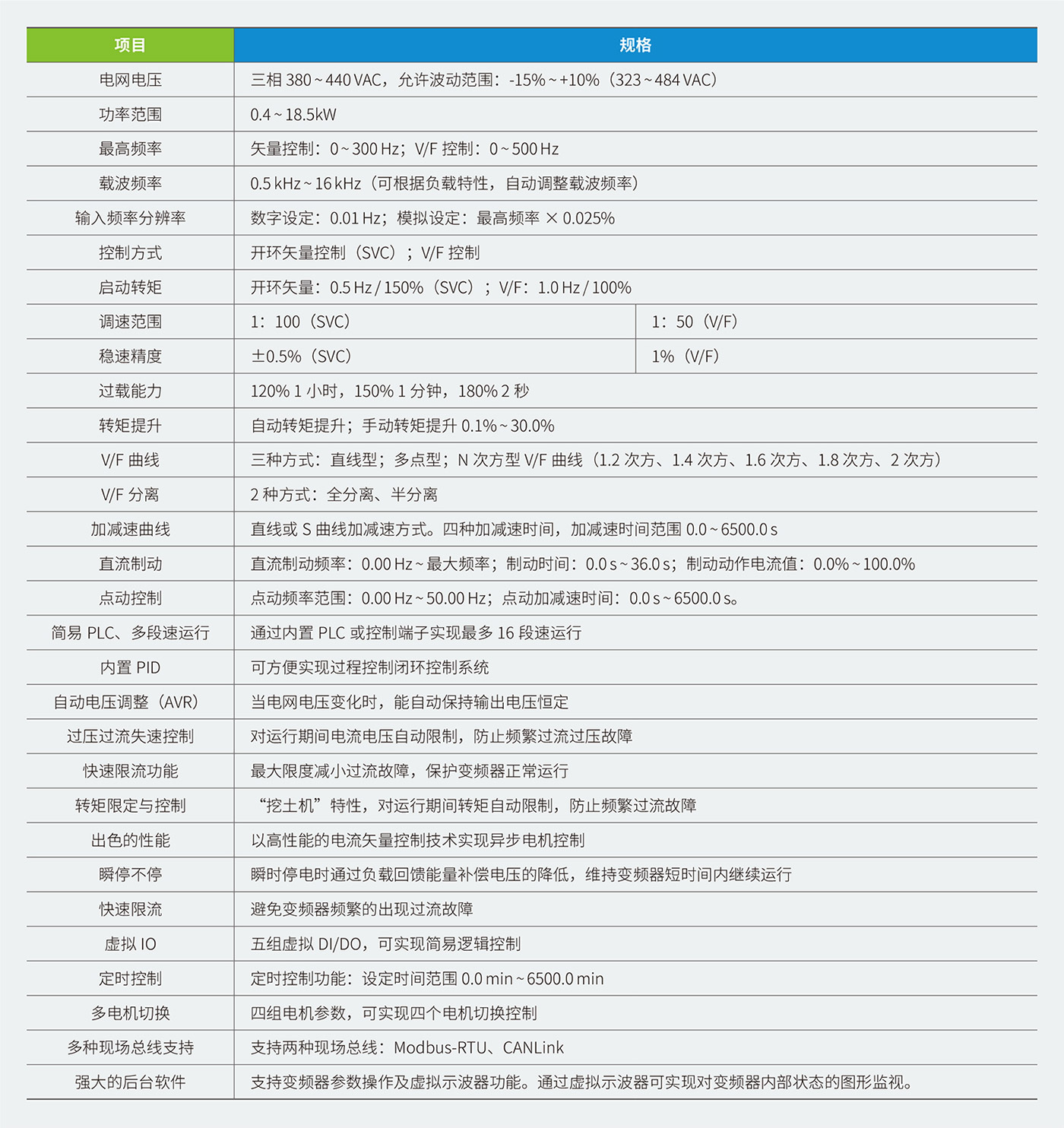 MD310系列變頻器是一款通用緊縮型多功能變頻器,采用開環(huán)矢量和V/F 控制方式,以高性能的電流矢量控制技術(shù)可實現(xiàn)異步電機控制。MD310 標(biāo)配RS485 通訊接口,支持Modbus RTU 通訊,可擴展I/O 擴展卡、CAN 通信擴展卡。內(nèi)置PID 可方便實現(xiàn)閉環(huán)過程控制系統(tǒng),最多可實現(xiàn)16 段速運行。